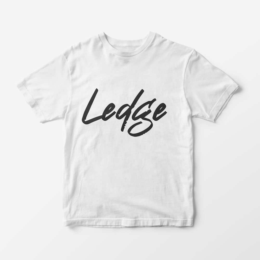 Ledge band apparel tee shirt in white and black soft cotton broadcloth. 100% ring-spun cotton. The body is preshrunk to minimize shrinkage. Available sizes S – XXL